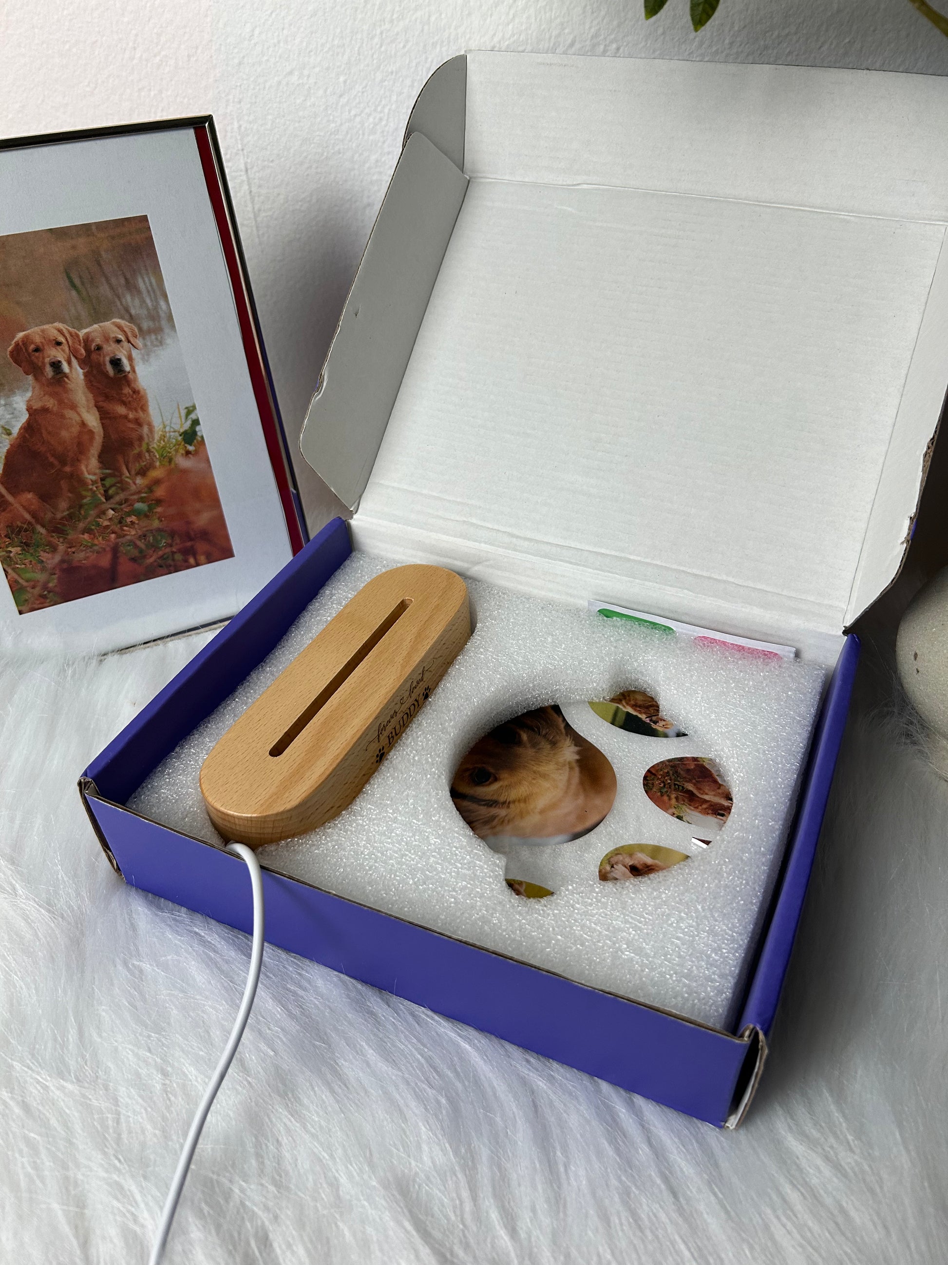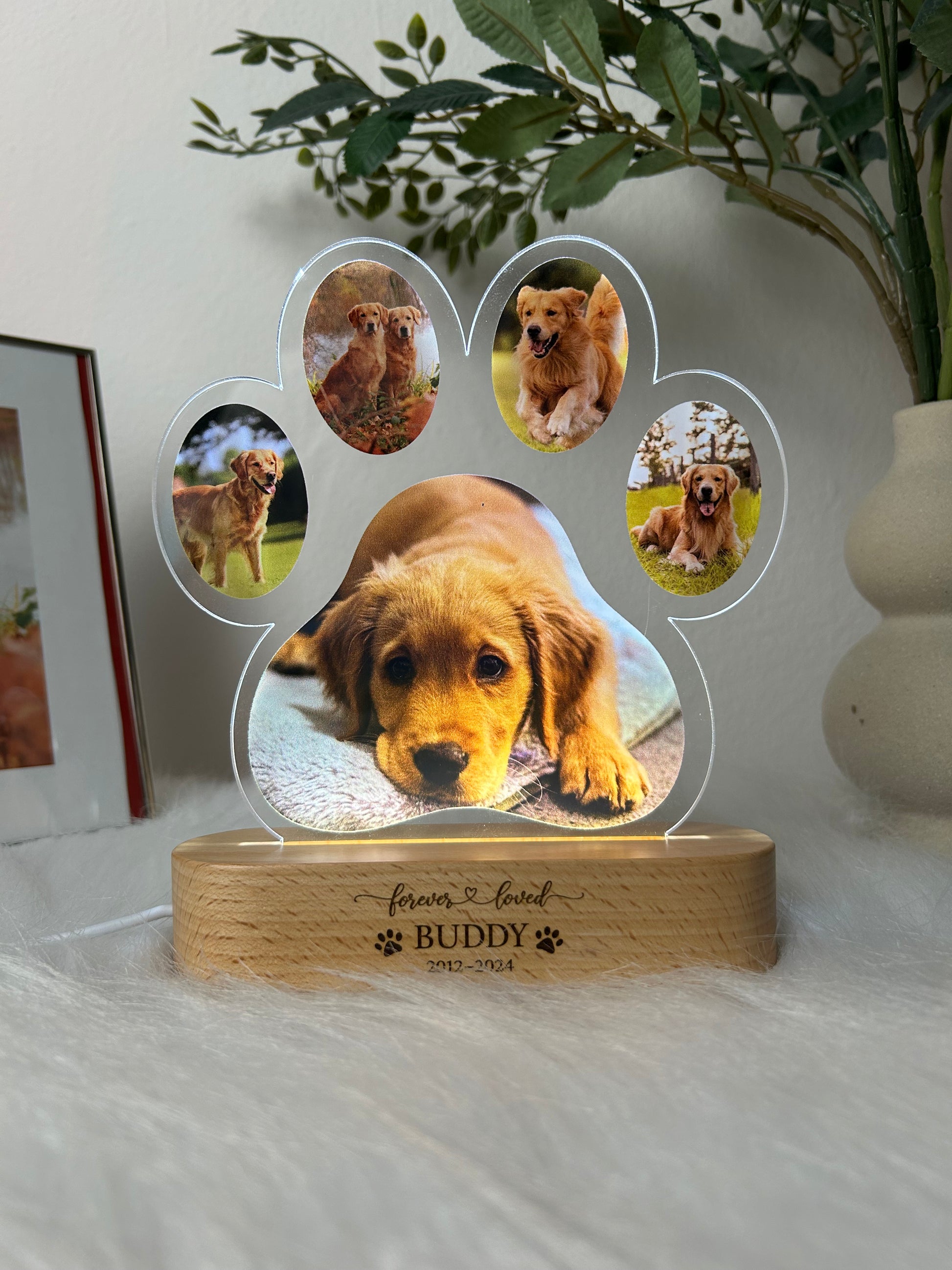 This lamp isn't off-the-shelf. It's built around your pet, your photos, and your words.